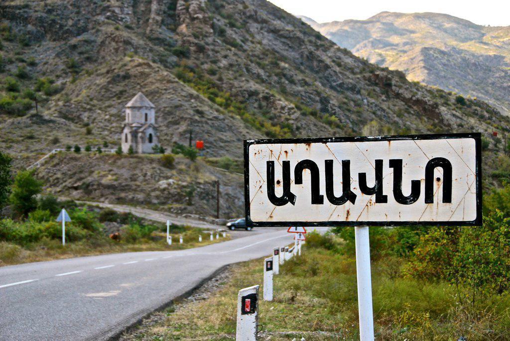 Արցախի Մարտունու Մսմնայից մինչև Շուշիի ներքևում տարածվող Մխիթարաշեն ու Շոշ երեք երկրների դրոշներ են ծածանվում մի բուռ տարածքի վրա։ Հետևում՝ Շուշին ու կանաչ ցելոֆանով պատված «գլխատված» Ղազա...